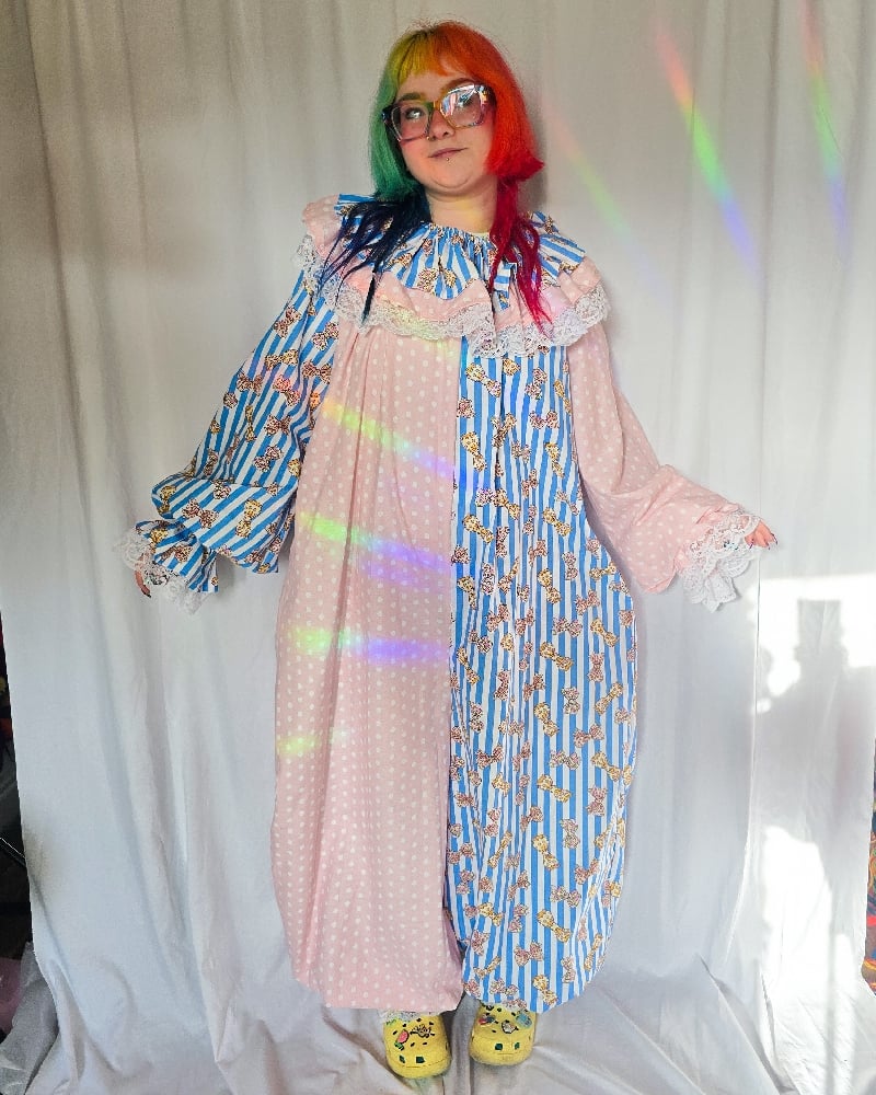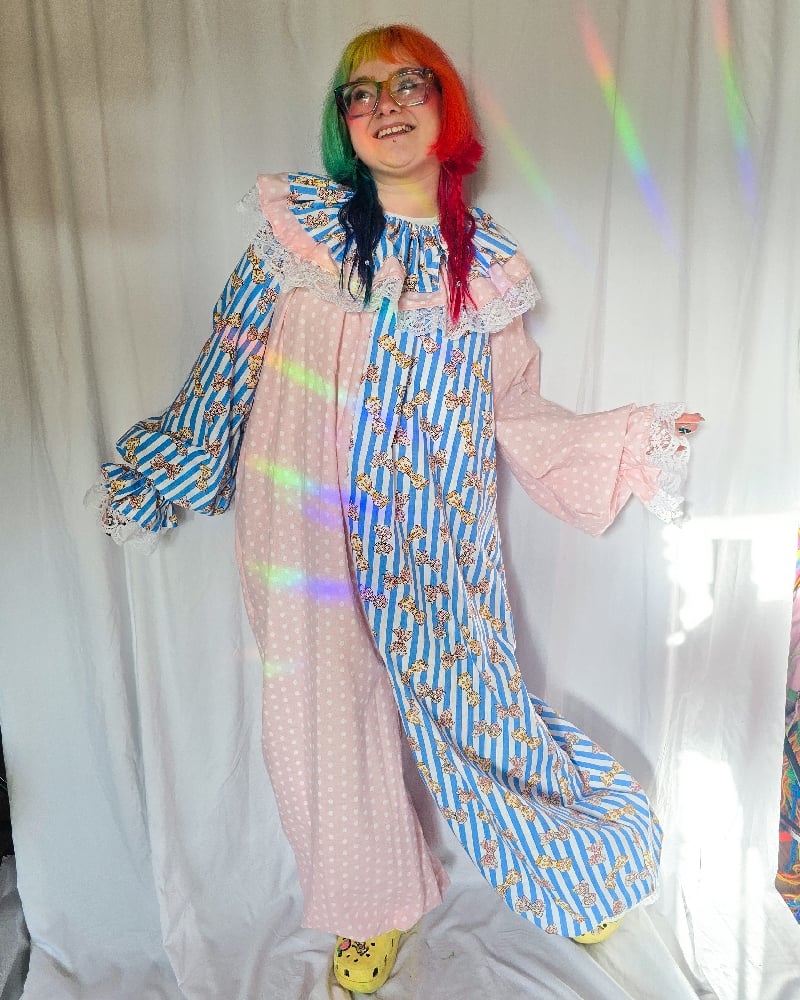 Size "large" clownsuit and collar made from vintage deadstock fabric and bedsheets with white lace trim.